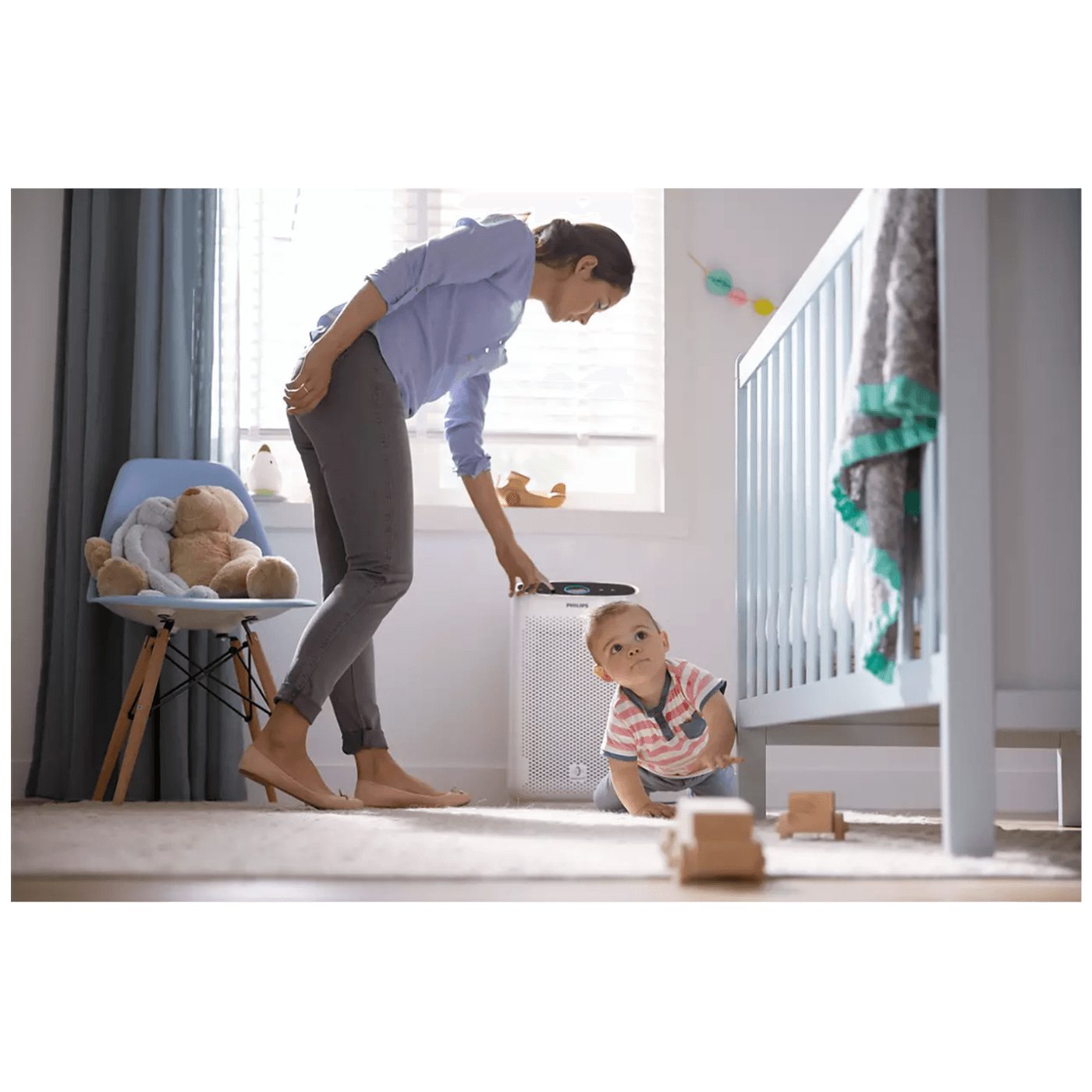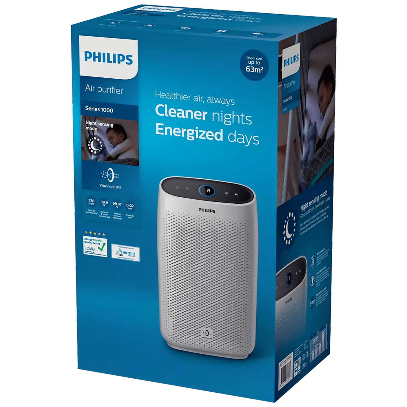 Samo jednim pritiskom tipke pročišćivač zraka filtrira nevidljive viruse, alergene ili onečišćivače u vašem domu kako bi bio čist i siguran. Pročišćuje brzo i učinkovito zahvaljujući stopi isporuke čistog zraka (CADR) od 270 m³/h.