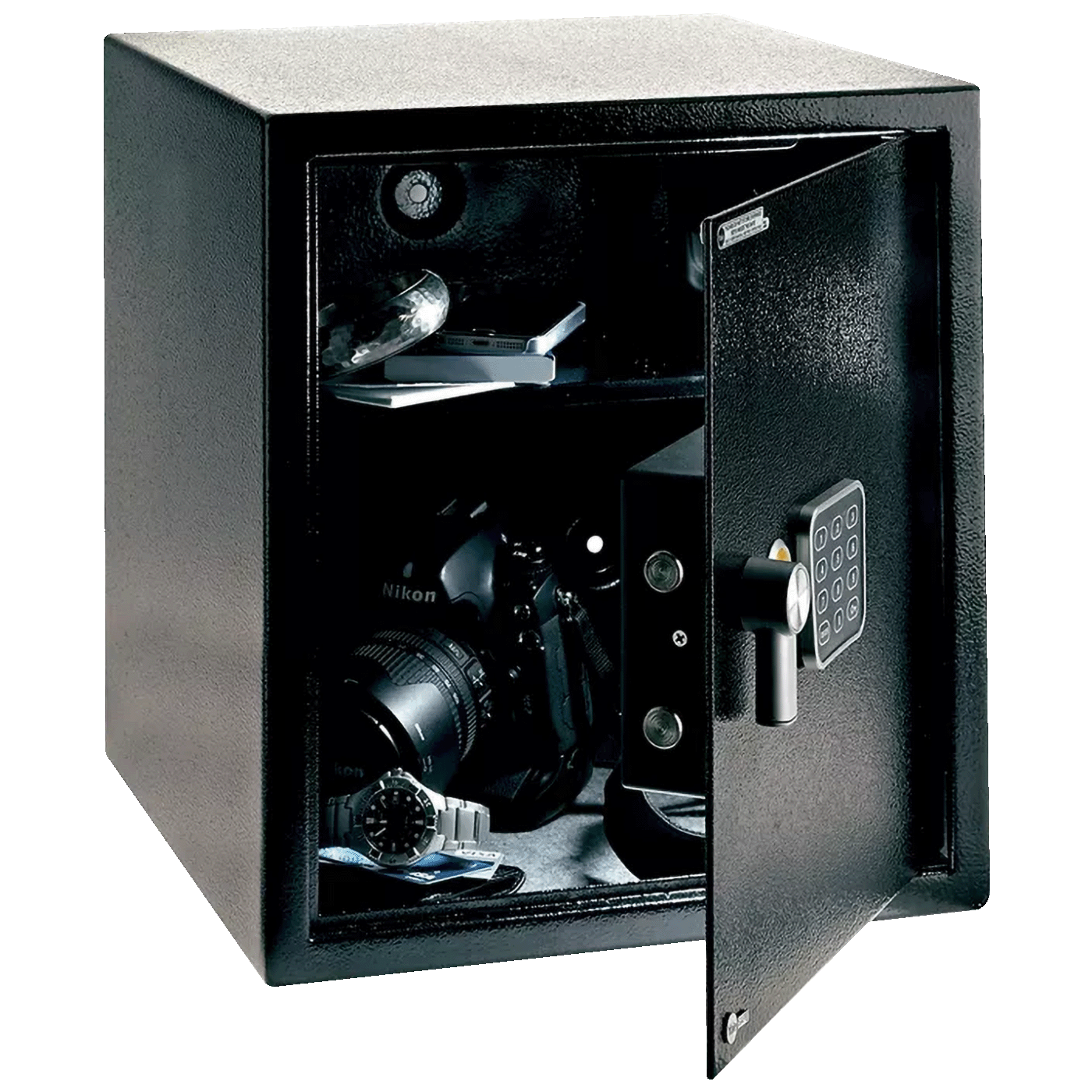 Sef je opremljen i mehaničkim rezervnim ključem koji omogućava pristup u slučaju zaboravljenog koda ili praznih baterija. Unutrašnjost sefa je obložena kako bi se zaštitili osjetljivi predmeti od ogrebotina, dok predviđene montažne rupe omogućavaju pričvršćivanje sefa za zid ili pod radi dodatne sigurnosti.
