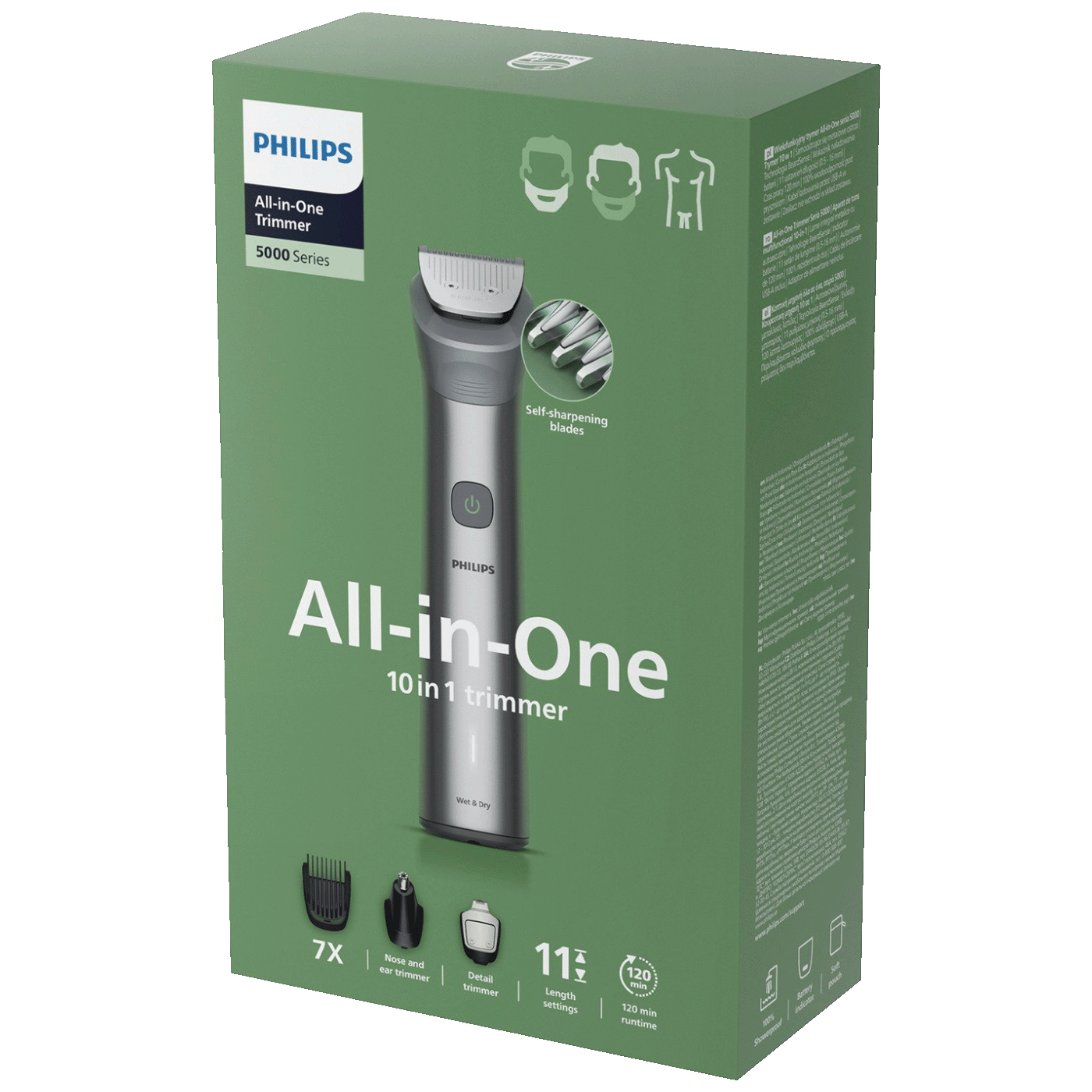 Philips Series 5000 MG5921/15 je praktičan i svestran uređaj za svakodnevno uređivanje brade, kose i dlačica na tijelu. Zahvaljujući velikom broju nastavaka, dugotrajnoj bateriji i samooštrećim oštricama, pruža pouzdane rezultate i jednostavnu upotrebu.