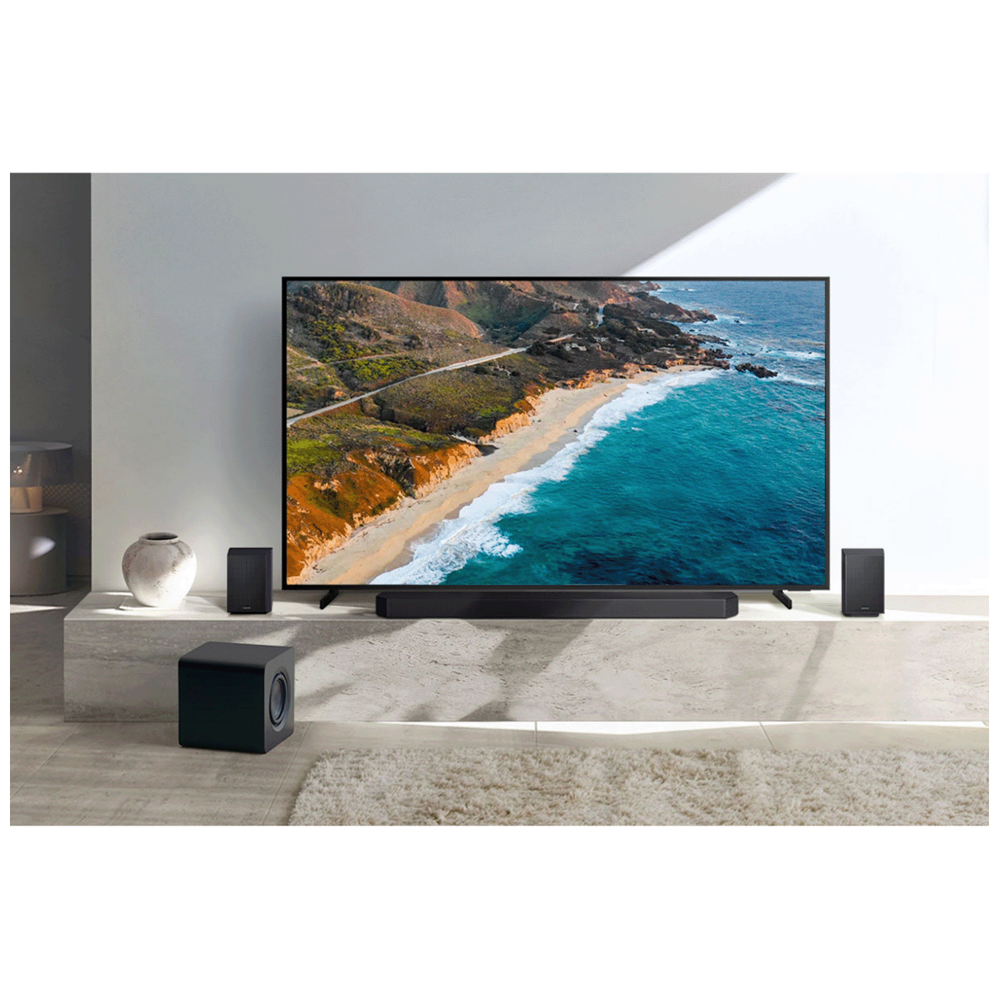 Q-Symphony funkcija omogućava savršenu sinhronizaciju sa kompatibilnim Samsung televizorima, gdje soundbar i TV zvučnici rade zajedno za bogatiji i precizniji zvuk. SpaceFit Sound Pro automatski analizira prostoriju i optimizira audio performanse, dok Active Voice Amplifier Pro poboljšava jasnoću dijaloga čak i u bučnijem okruženju.