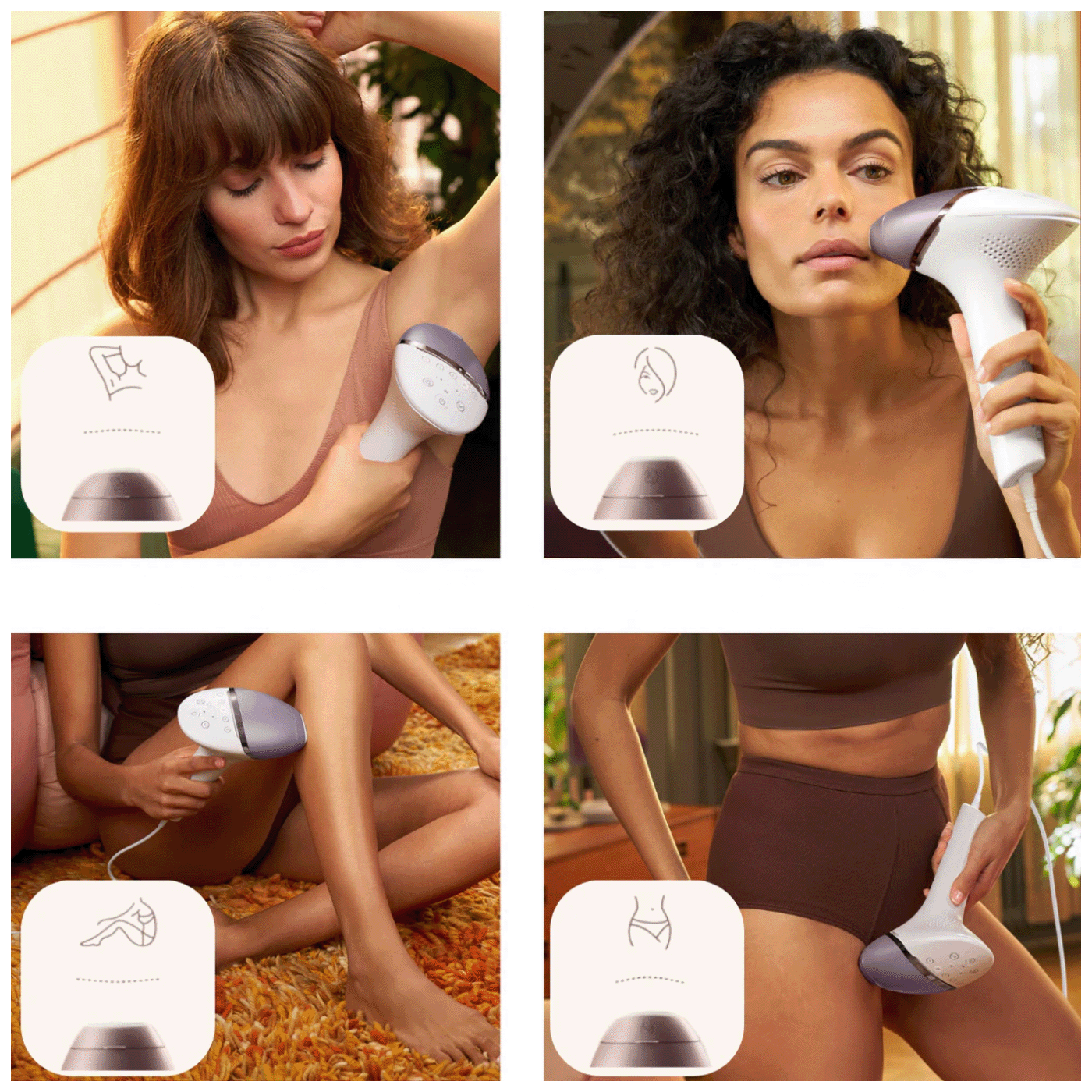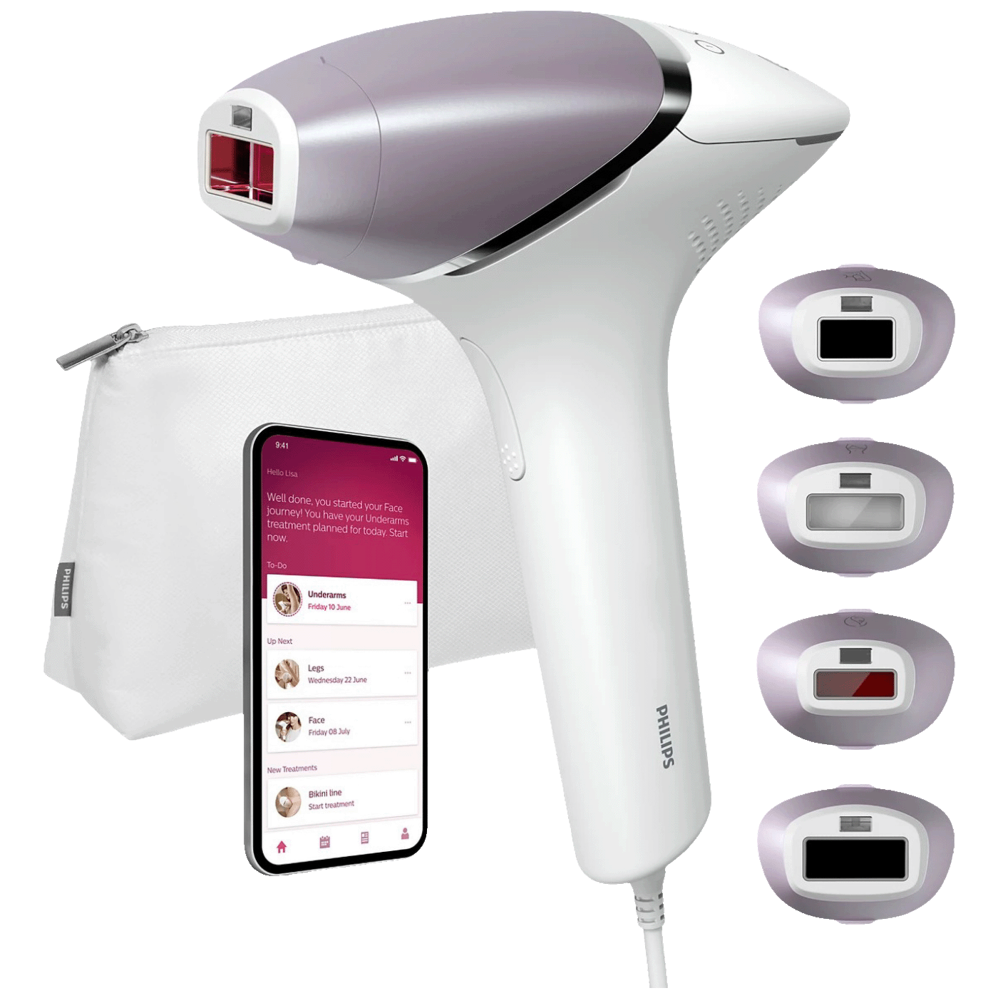 Posebno dizajnirani dodaci savršeno pristaju oblinama vašeg tijela i pokreću najučinkovitije programe za svako područje tijela kada su povezani. Lice: ravan dizajn i mali prozor s UV filterom. Tijelo: zakrivljeno prema unutra s velikim prozorom. Bikini i pazuh: Zakrivljeni prema van za teško dostupna područja.