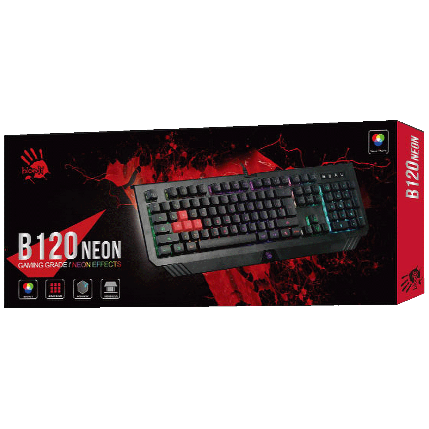 Bloody B120N je gejmerska žičana tastatura sa Neon LED pozadinskim osvjetljenjem i Anti‑Ghosting tehnologijom koja omogućava da više tipki radi istovremeno bez grešaka. Dizajnirana je za online igranje različitih žanrova s 1000 Hz polling stopom i ultra‑brzim odzivom od 1 ms, što osigurava precizne i brze reakcije. Tastatura ima Game Mode funkciju koja onemogućava Windows tipku tokom igranja, Neon Backlight sa podešavanjem svjetline te izdržljivu konstrukciju otporna na prskanje i klizanje zahvaljujući anti‑slippery lift‑ovima.